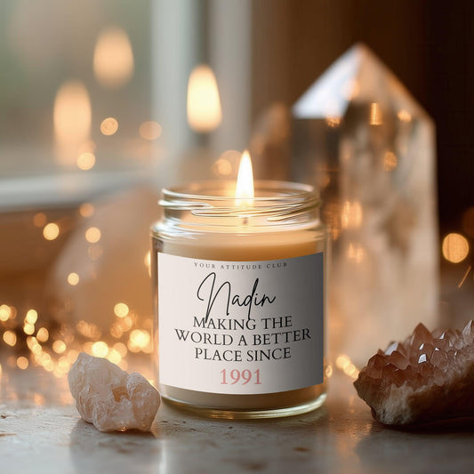 Making the world a better place since – Personalisierte Kerze mit Namen & Jahr, lustige Geschenkidee für Geburtstag, Freunde & Familie, veganes Sojawachs