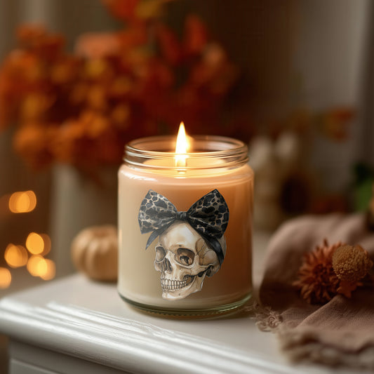 Skull Kerze mit Schleife Halloween Deko Duftkerze Glas vegan Sojawachs, Herbstkerze Geschenkidee Frauen, Gothic Deko, Leoparden Muster