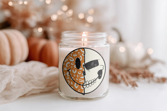Smiley Skull Kerze Halloween Duftkerze Glas vegan Sojawachs, Retro Smiley Candle, Herbstdeko Geschenkidee Frauen, spooky Home Decor