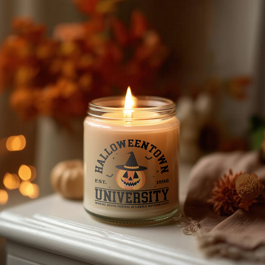 Halloweentown University Kerze Halloween Duftkerze Glas vegan Sojawachs Herbstdeko Homedecor Geschenkidee