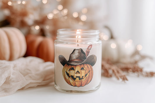 Cowboy Pumpkin Kerze Halloween Duftkerze Herbstdeko Glas vegan Sojawachs Geschenkidee Homedecor Spooky Season