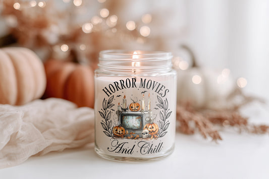 Horror Movies and Chill Kerze Halloween Duftkerze Herbstdeko, vegane Sojawachs Kerze im Glas, Cozy Candle Geschenkidee Frauen, Home Decor