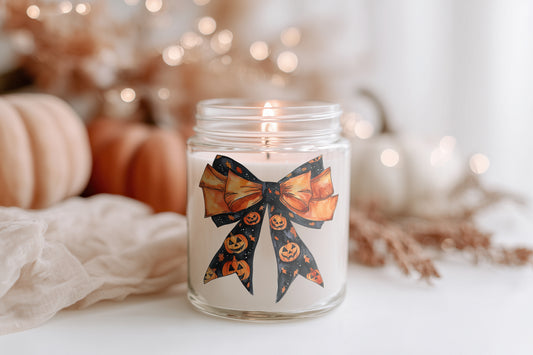 Halloween Schleifen Kerze Herbst Duftkerze Glas | Kürbisdeko, vegane Sojawachs Kerze, Geschenkidee, Cosy Season Deko & Halloween Accessoire