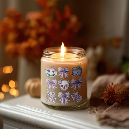 Halloween Stuff Kerze lila Bow Deko | vegane Duftkerze Glas, spooky Season Herbstkerze, Geschenkidee, Kürbis, Schädel & Hexenkessel Motiv