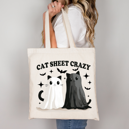 Cat Sheet Crazy Tragetasche – Lustige Halloween Baumwolltasche mit Katzen Motiv – Geschenk für Katzenfans – Rosa Beige Schwarz – Auch als Bügelbild erhältlich