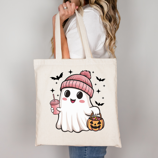 Halloween Tasche Beige – Süßer Ghost mit Pumpkin & Coffee Baumwollbeutel für Herbst, DTG Druck, auch als DIY A4/A3 Bügelbild für Shirt, Jacke oder Kissen