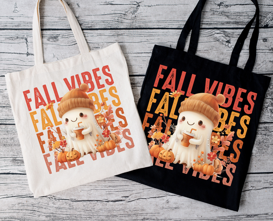 Fall Vibes Tragetasche mit süßem Geist | Herbst Baumwollbeutel Halloween Motiv | Stoffbeutel Beige Rosa Schwarz | Optional als Bügelbild