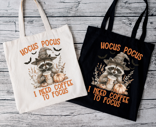 Halloween Baumwolltasche „Hocus Pocus I Need Coffee To Focus“ – lustiger Waschbär mit Kaffee – Geschenk für Herbstliebhaber – Beutel in Schwarz, Beige, Rosa – auch als Bügelbild erhältlich