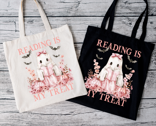 Reading is my Treat Tote Bag – Halloween Bücherliebhaber Tasche aus Baumwolle – Ghost Girl Print – Rosa, Beige oder Schwarz – auch als Bügelbild