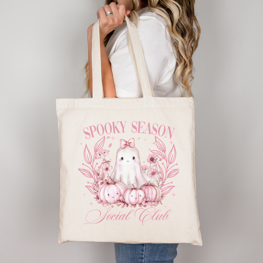 Spooky Season Social Club Halloween Tasche aus Baumwolle – Rosa, Beige, Schwarz – Süßes Geist-Motiv – DTG-Druck – Tragetasche & Bügelbild