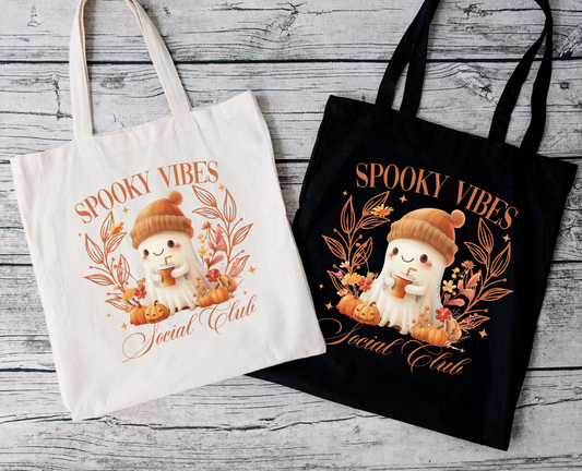 Spooky Vibes Social Club Tasche Halloween Beutel aus Baumwolle – DTG Druck – Rosa, Beige oder Schwarz – Motiv auch als Bügelbild für T-Shirts, Kissen & mehr