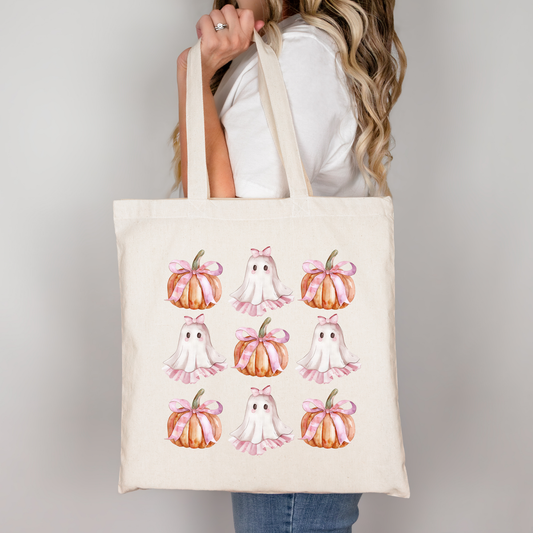 Süßer Kürbis & Geist Beutel – Halloween Tote Bag Baumwolle – Rosa, Beige, Schwarz – Bügelbild für T-Shirts, Kissen, Jacken & mehr