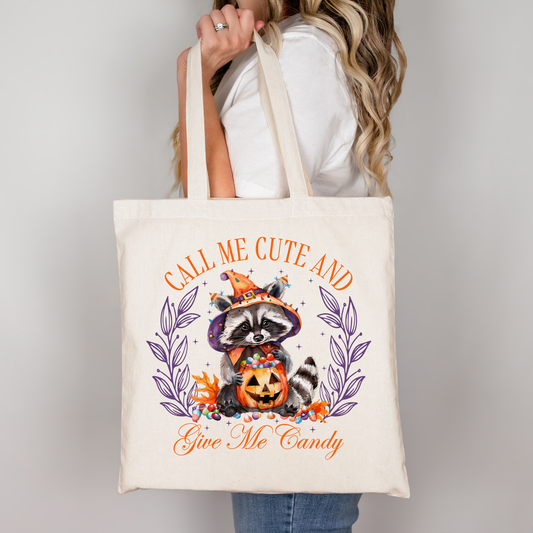 Call Me Cute And Give Me Candy Halloween Tasche Beige – Waschbär Kürbis Beutel, Baumwolltasche, DTG Druck, A4 A3 Aufbügler, DIY Patch für Shirts & Deko
