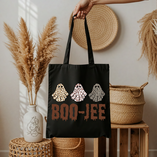 BOO-JEE Geister Tragetasche Leopard Style Schwarz – Halloween Bag, Baumwollbeutel mit Spruch, spooky Tote Bag, DTG Print, Bügelbild A4 & A3, Geschenk Idee