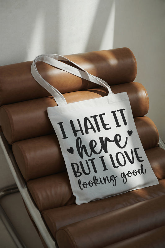 I hate it here but I love looking good Baumwolltasche Stoffbeutel Spruch Bag Fashion Shopping Tasche nachhaltig Schultertasche Geschenk Damen