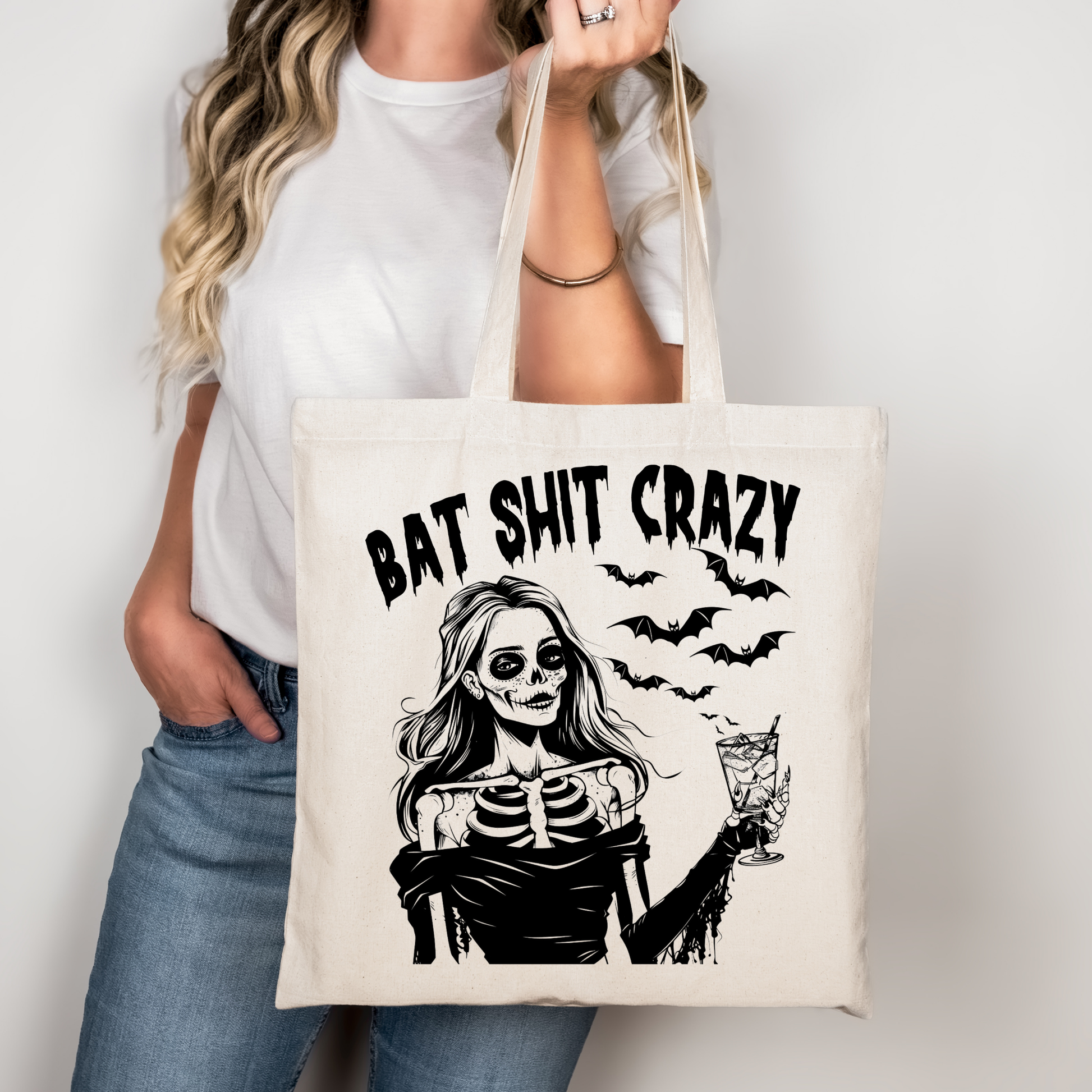 Bat Shit Crazy Halloween Tragetasche – Gruselig-lustiger Skelett Beutel mit Fledermäusen – 48x42 cm Baumwolltasche – Rosa, Beige oder Schwarz – DTG Druck – Auch als Bügelbild