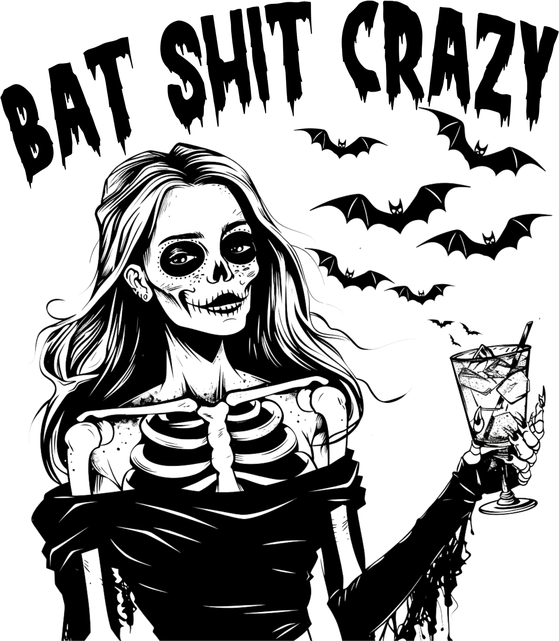 Bist du ein bisschen crazy – und stolz drauf? Dann ist diese „Bat Shit Crazy“ Halloween Tragetasche genau dein Style! Das freche Design zeigt eine skelettierte Frau mit Drink in der Hand, umgeben von Fledermäusen – perfekt für Hexen, Horror-Queens und alle, die spooky & sassy kombinieren wollen.