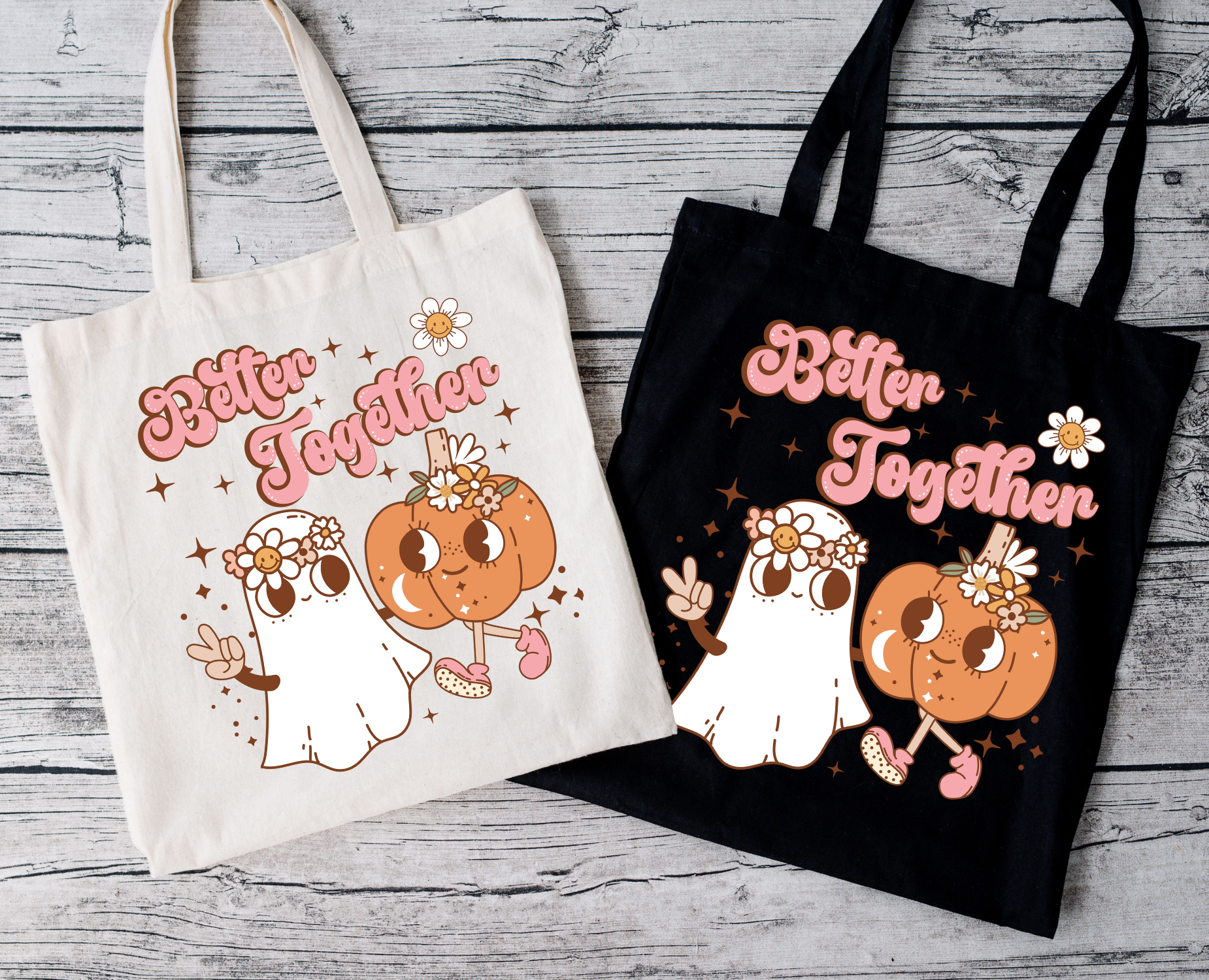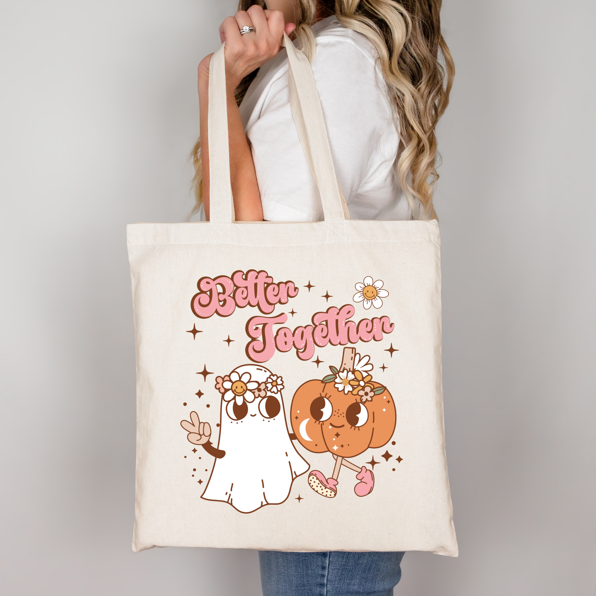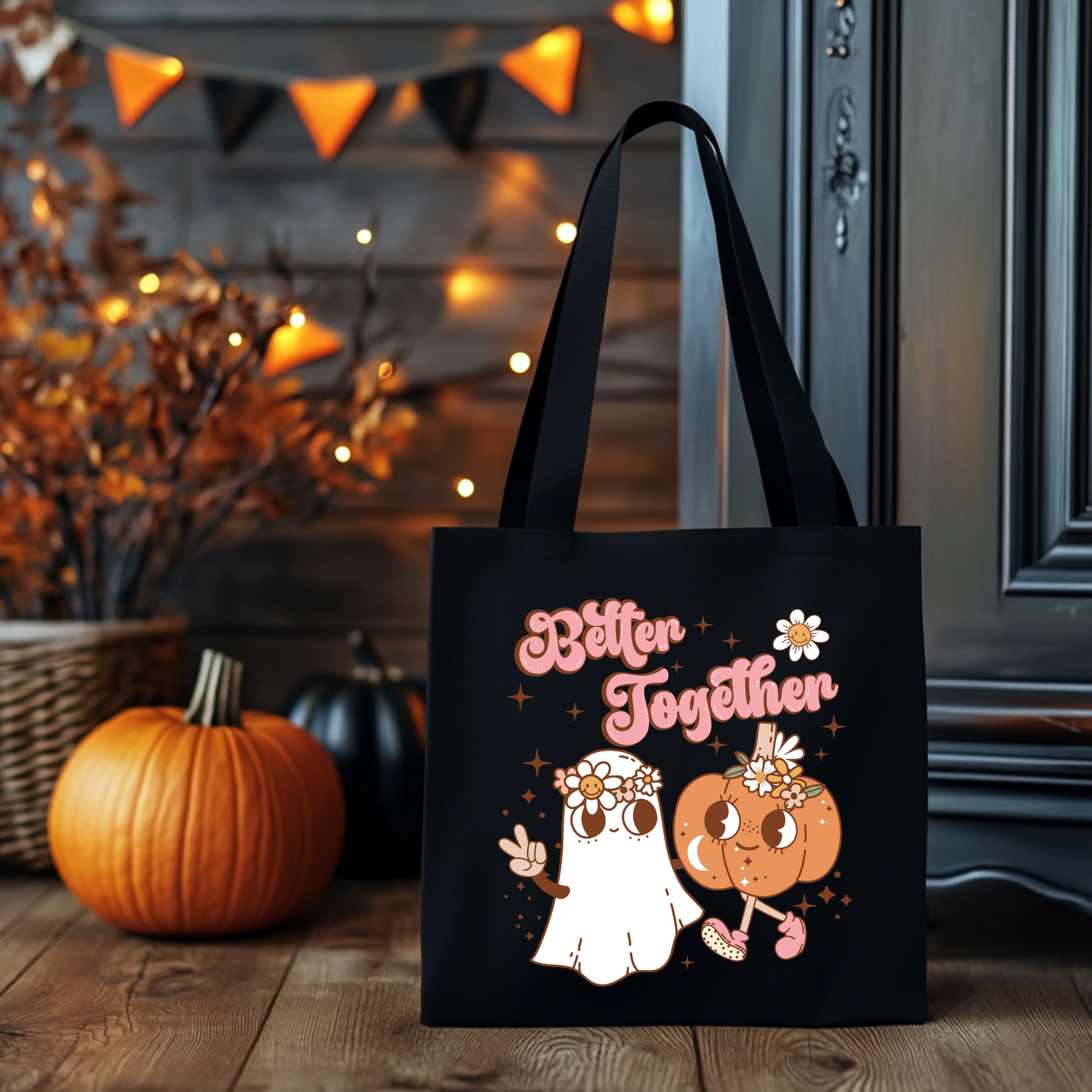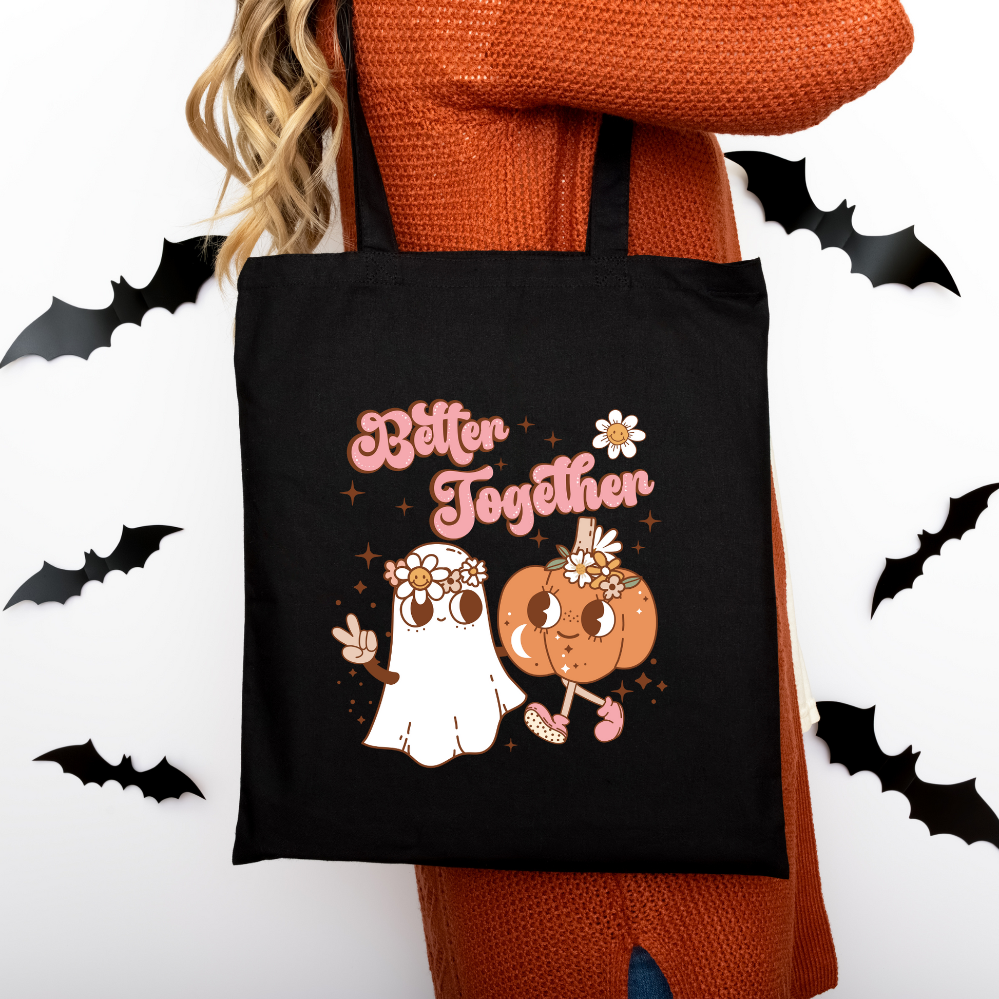 Better Together Tragetasche – Süßer Halloween Beutel mit Geist & Kürbis Motiv – Bedruckte Baumwolltasche 48x42cm – Rosa, Beige oder Schwarz