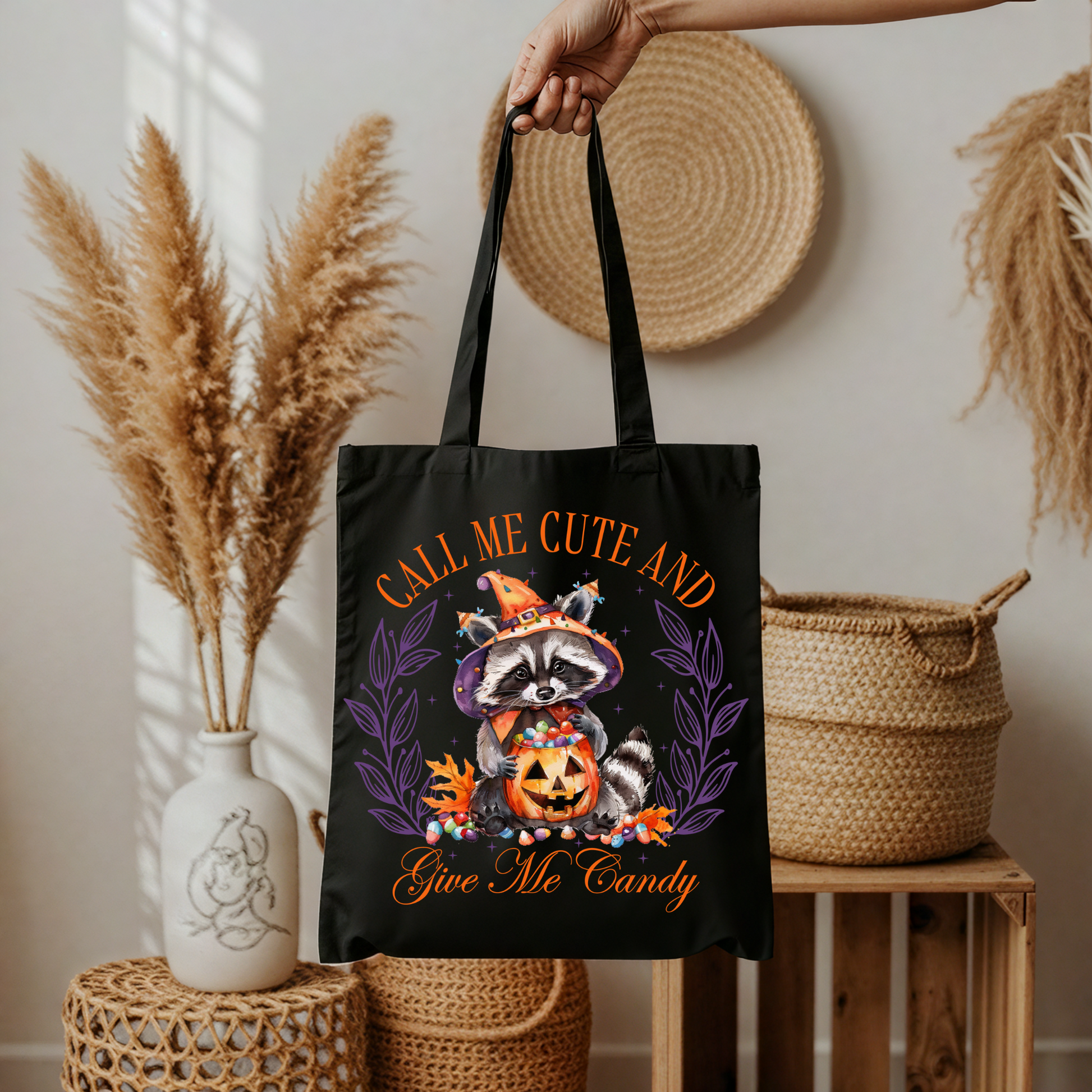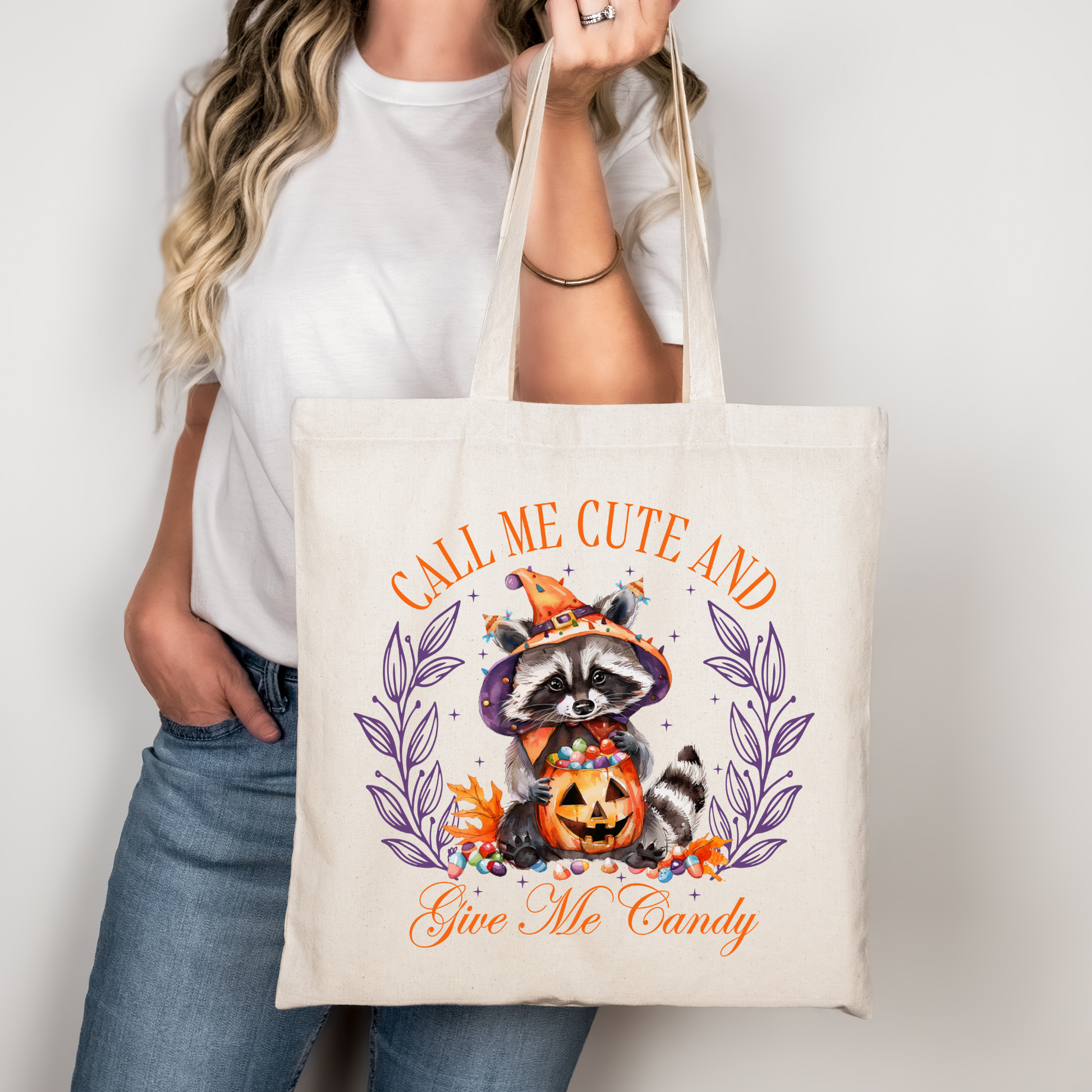 Call Me Cute And Give Me Candy Halloween Tasche Beige – Waschbär Kürbis Beutel, Baumwolltasche, DTG Druck, A4 A3 Aufbügler, DIY Patch für Shirts & Deko