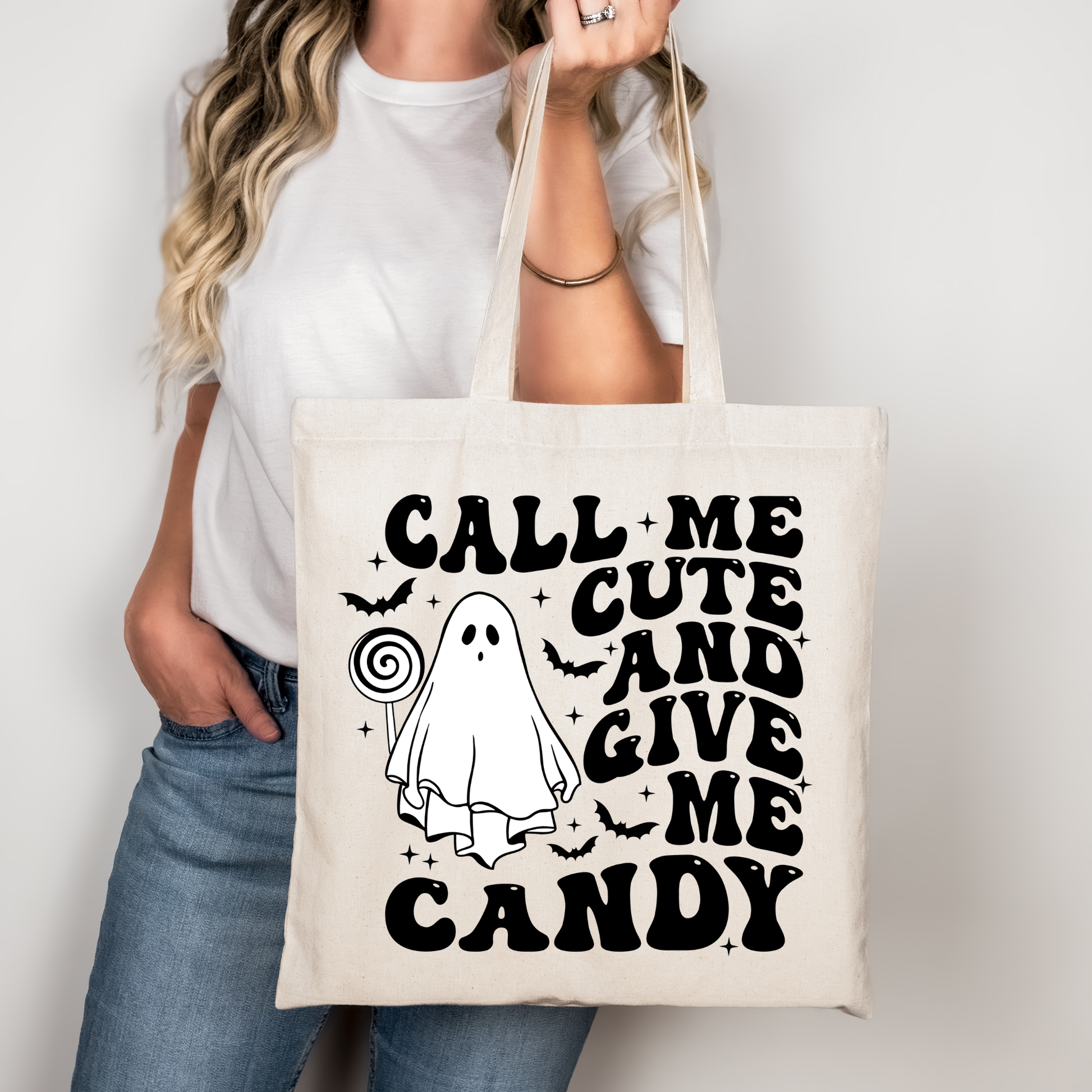„Call Me Cute And Give Me Candy“ Baumwolltasche (38x42 cm, 70 cm Henkel) in Rosa oder Beige mit hochwertigem DTG-Druck. Auch als Bügelbild erhältlich – ideal für Upcycling & personalisierte Halloween-Geschenke.