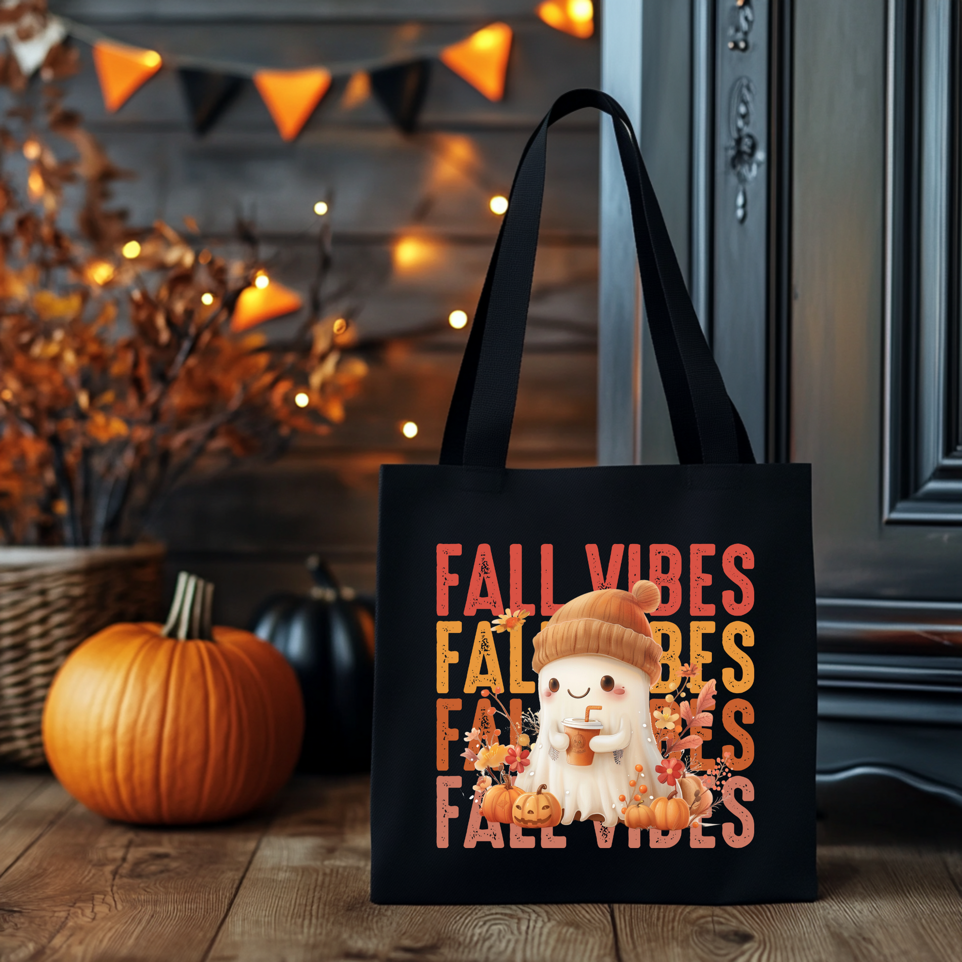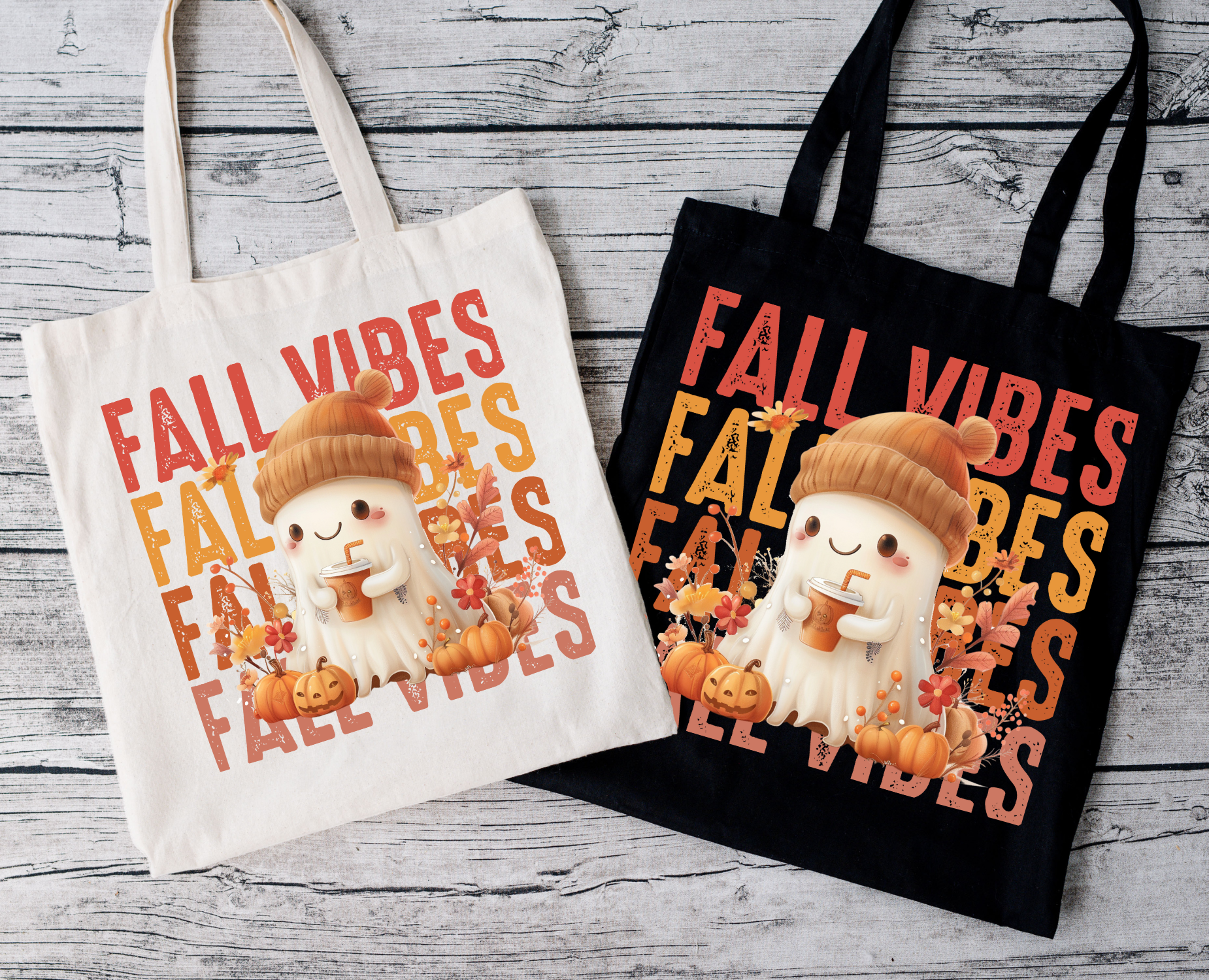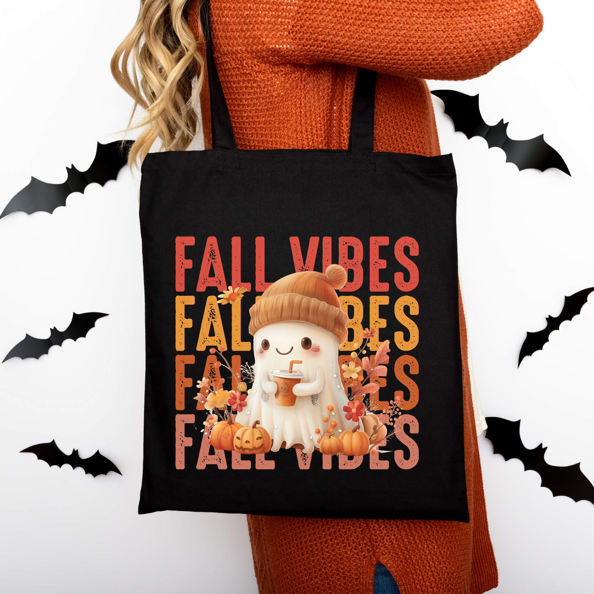 Herbstliche Stofftasche mit süßem Geist & “Fall Vibes”-Print. In Beige, Rosa oder Schwarz – perfekt für Halloween, Herbstspaziergänge oder als Geschenk. Motiv auch als Bügelbild erhältlich.