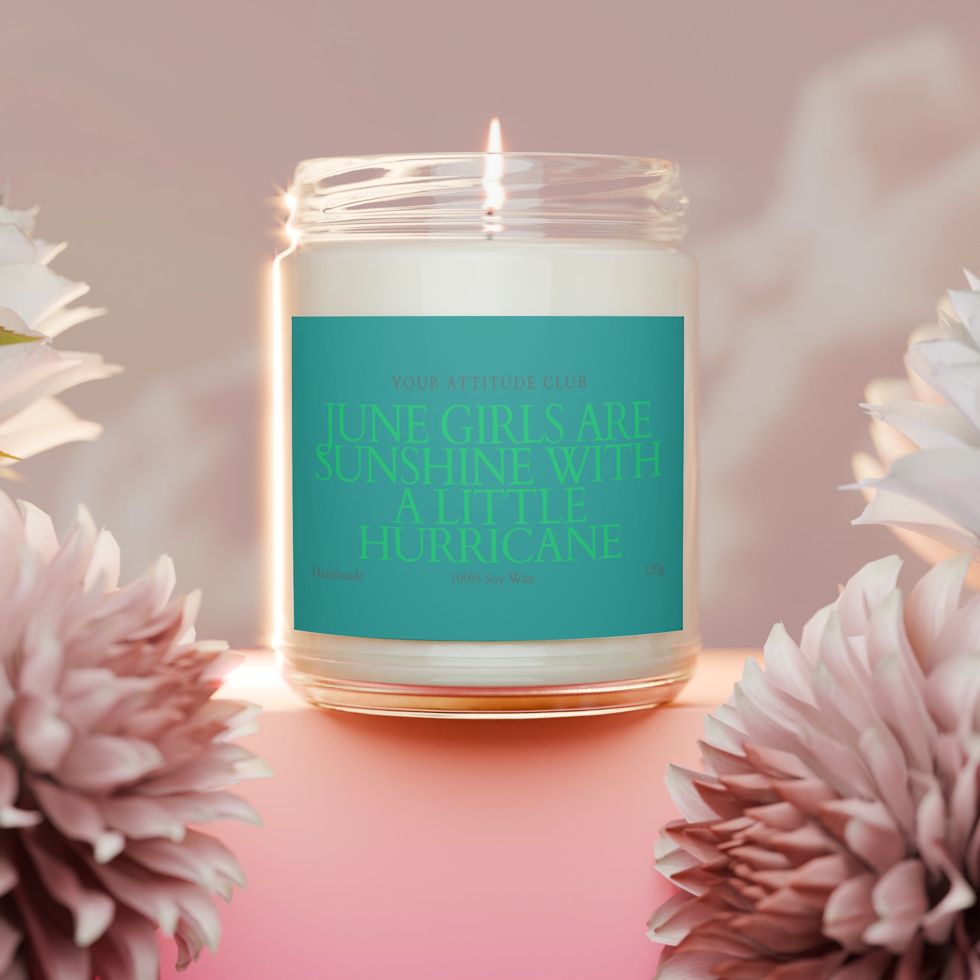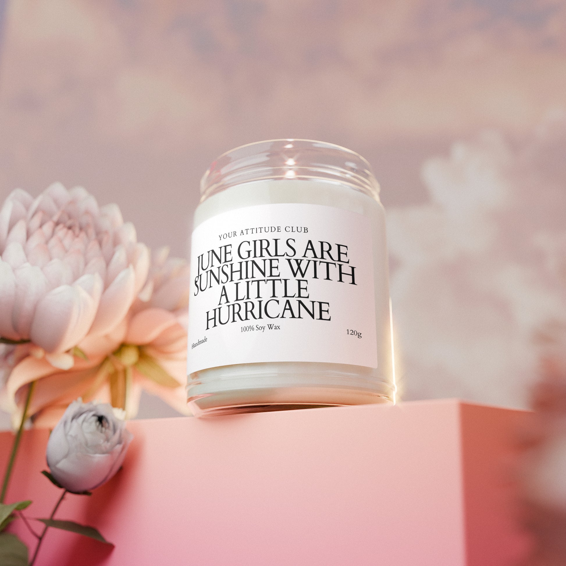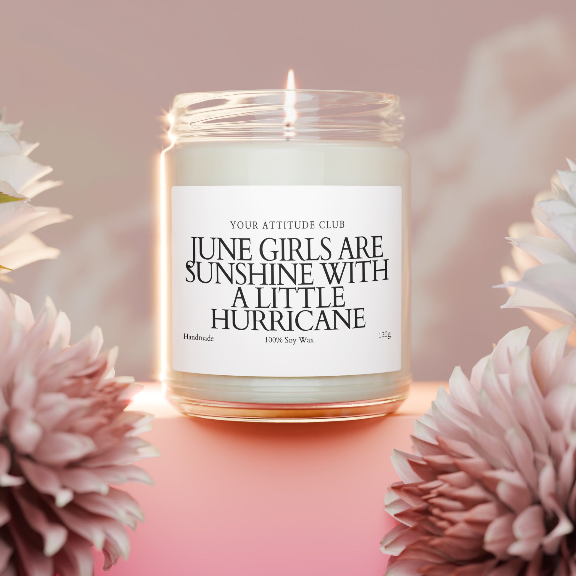 June Girls Are Sunshine With a Little Hurricane – Geburtstagskerze personalisiert, Geschenkidee Frau Juni, Duftkerze 120ml, Etikettfarbe wählbar, handmade