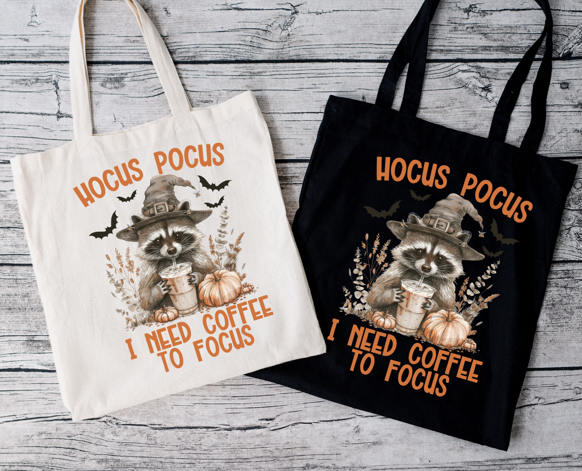 Lustige Halloween Baumwolltasche mit Waschbär und Kaffee – „Hocus Pocus I Need Coffee To Focus“. In Schwarz, Beige oder Rosa. Auch als Bügelbild für Shirts, Kissen & mehr erhältlich.