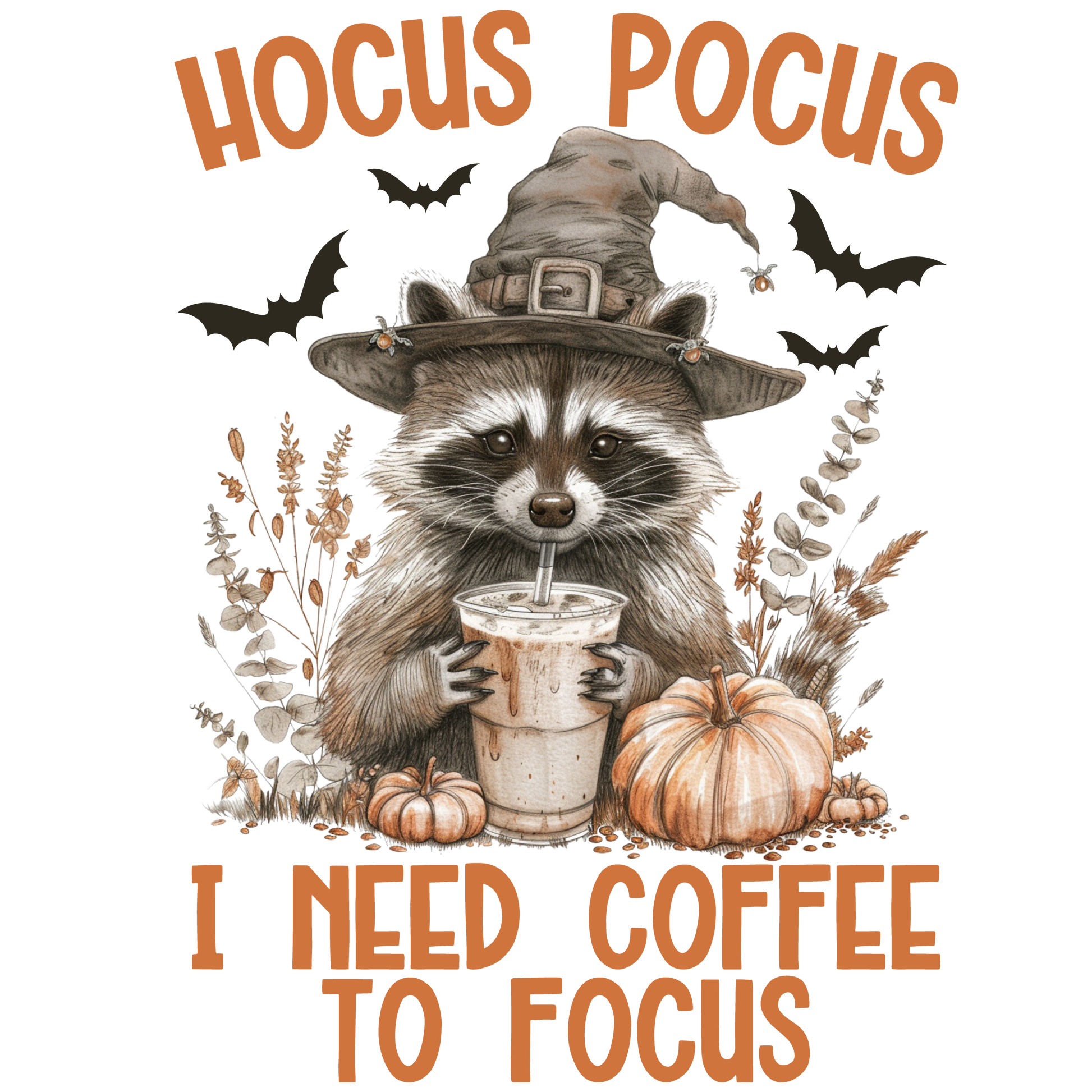 Mach deinen Herbstlook komplett mit unserer witzigen Halloween-Baumwolltasche im angesagten Vintage-Stil! Der süße Waschbär mit Hexenhut, Coffee-to-go-Becher und Kürbissen trägt den Spruch „Hocus Pocus – I Need Coffee To Focus“ – das perfekte Accessoire für Kaffeejunkies und Herbstliebhaber.