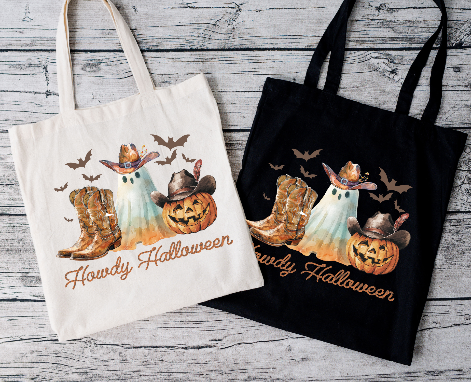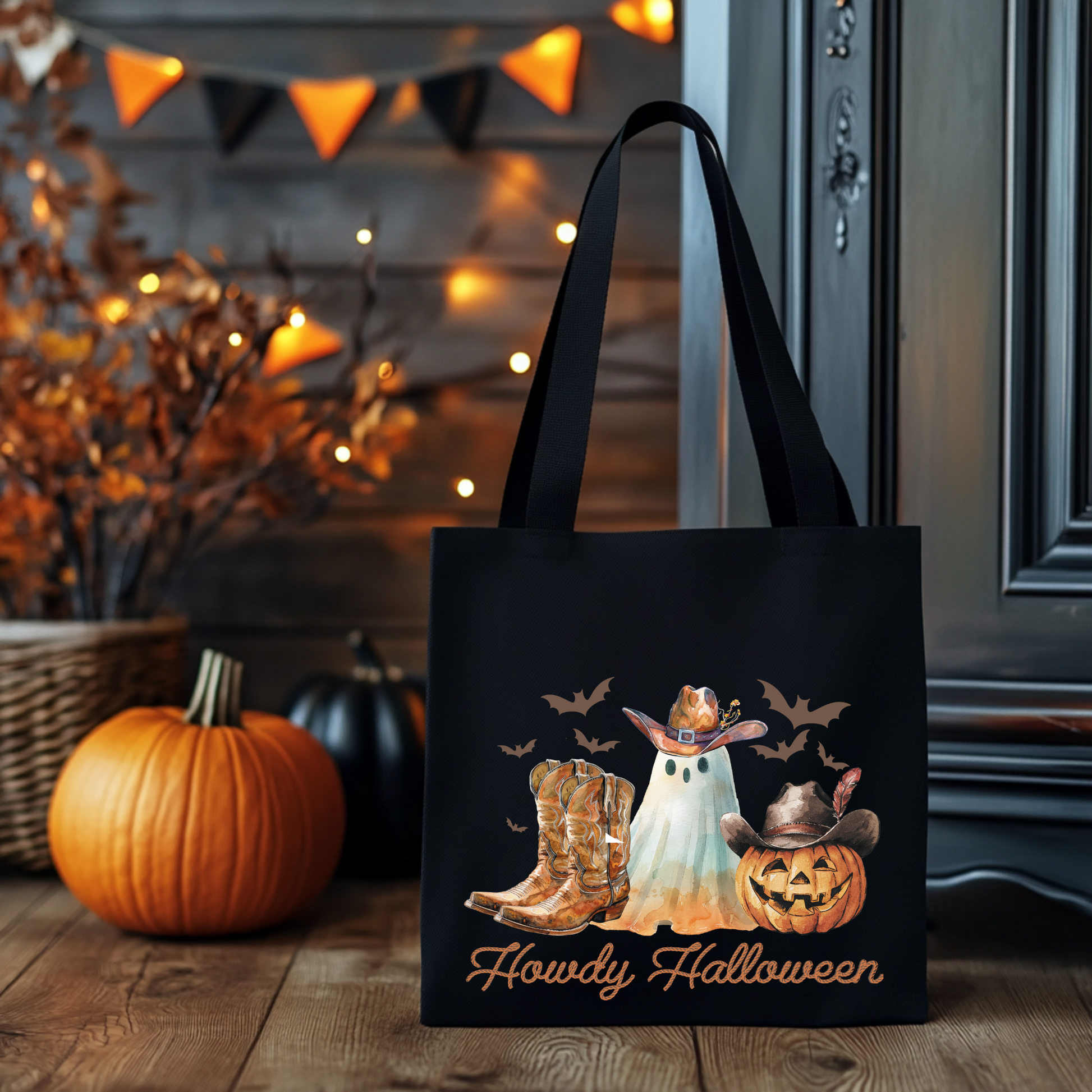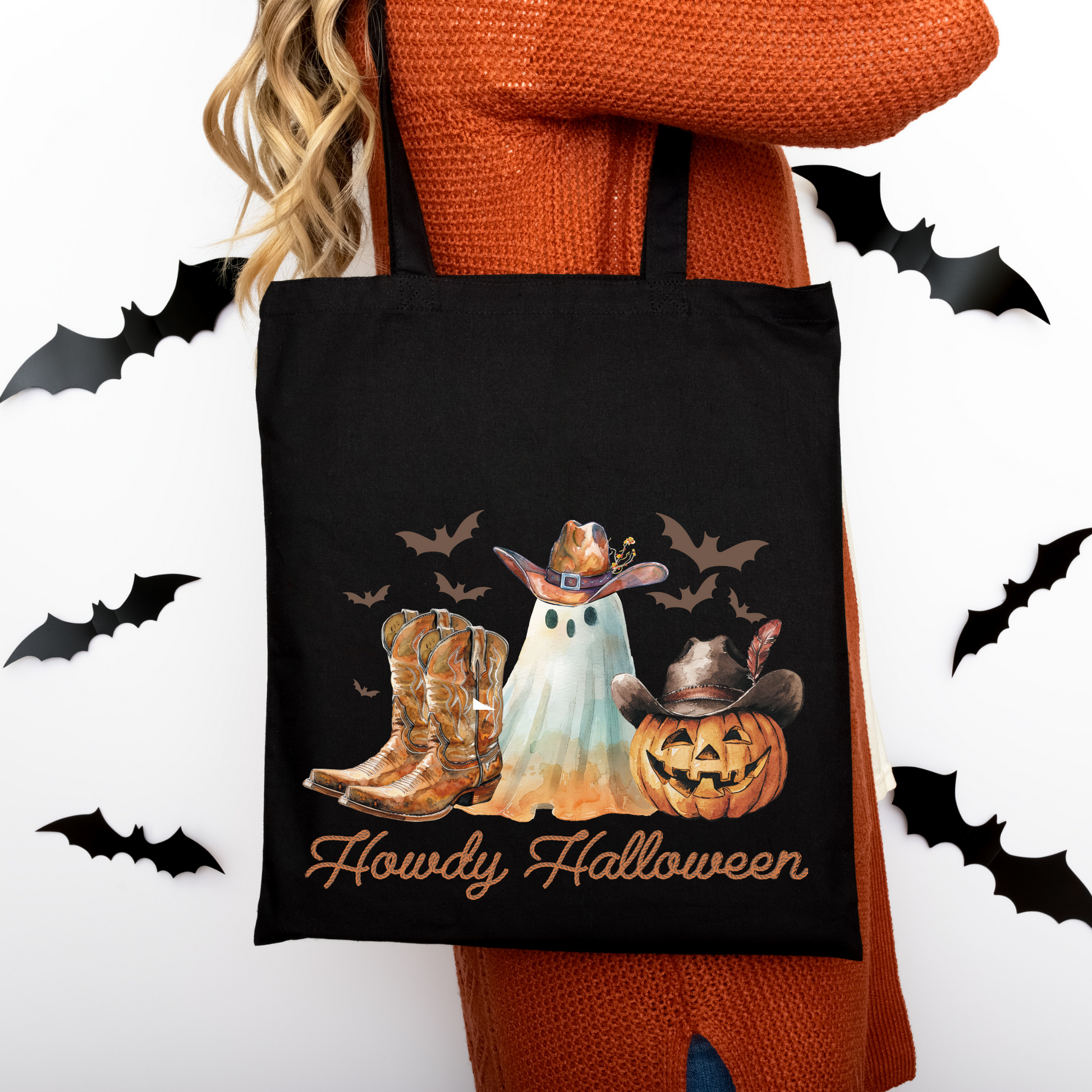Howdy Halloween Beutel mit Cowboy-Geist, Kürbis & Boots – perfekt für dein Halloween-Outfit! Erhältlich als Tragetasche & Bügelbild für Shirts, Kissen & mehr. Waschbar, langlebig, hochwertiger DTG-Druck.
