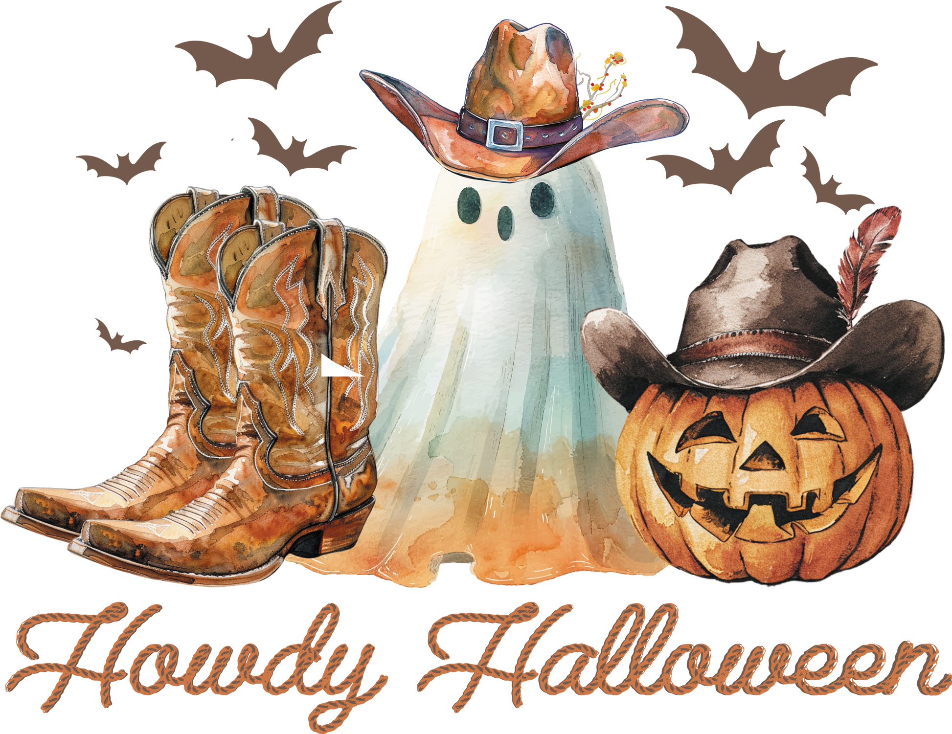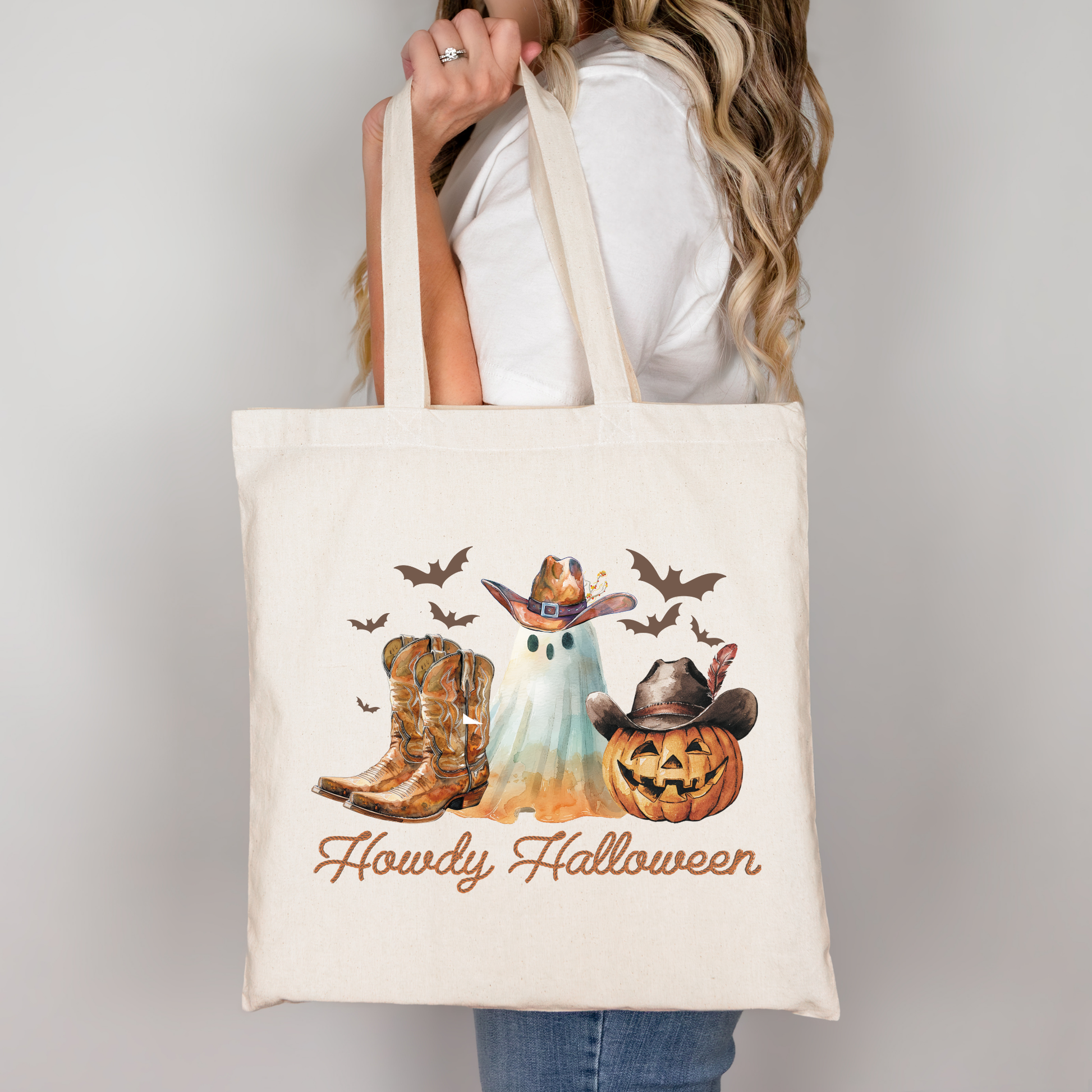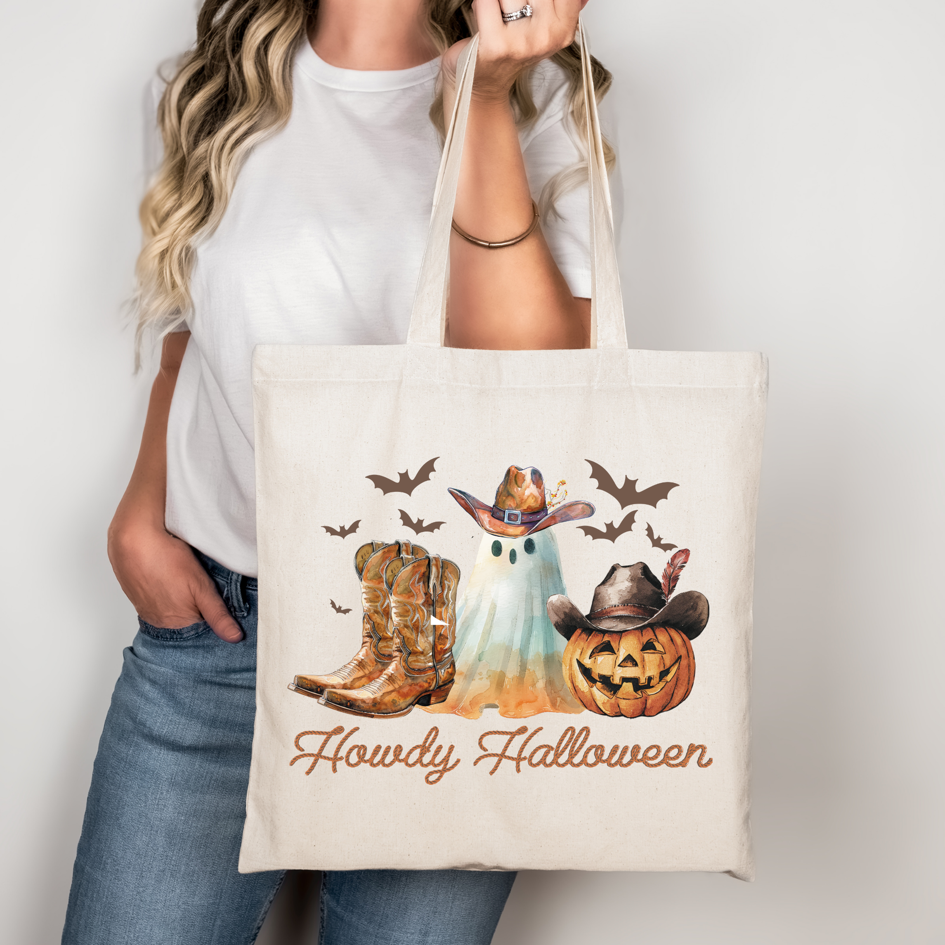 Howdy Halloween Beutel mit Cowboy-Geist, Kürbis & Boots – perfekt für dein Halloween-Outfit! Erhältlich als Tragetasche & Bügelbild für Shirts, Kissen & mehr. Waschbar, langlebig, hochwertiger DTG-Druck.