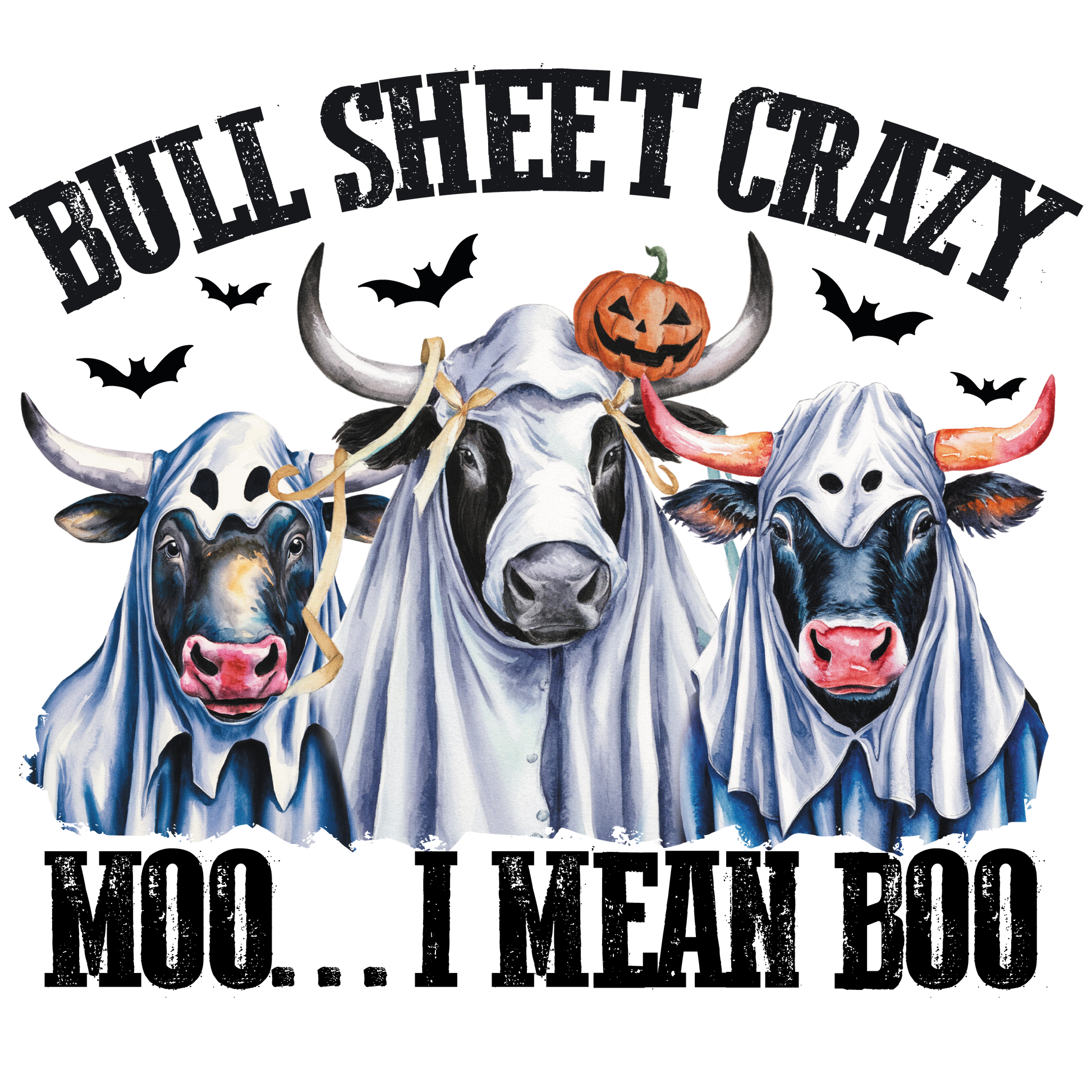 Lustige Halloween Tasche aus Baumwolle mit Kuh-Motiv & Spruch „Bull Sheet Crazy – Moo… I Mean Boo“. In Beige, Rosa & Schwarz. Auch als Bügelbild erhältlich – perfekt für Halloween & Kuh-Fans!