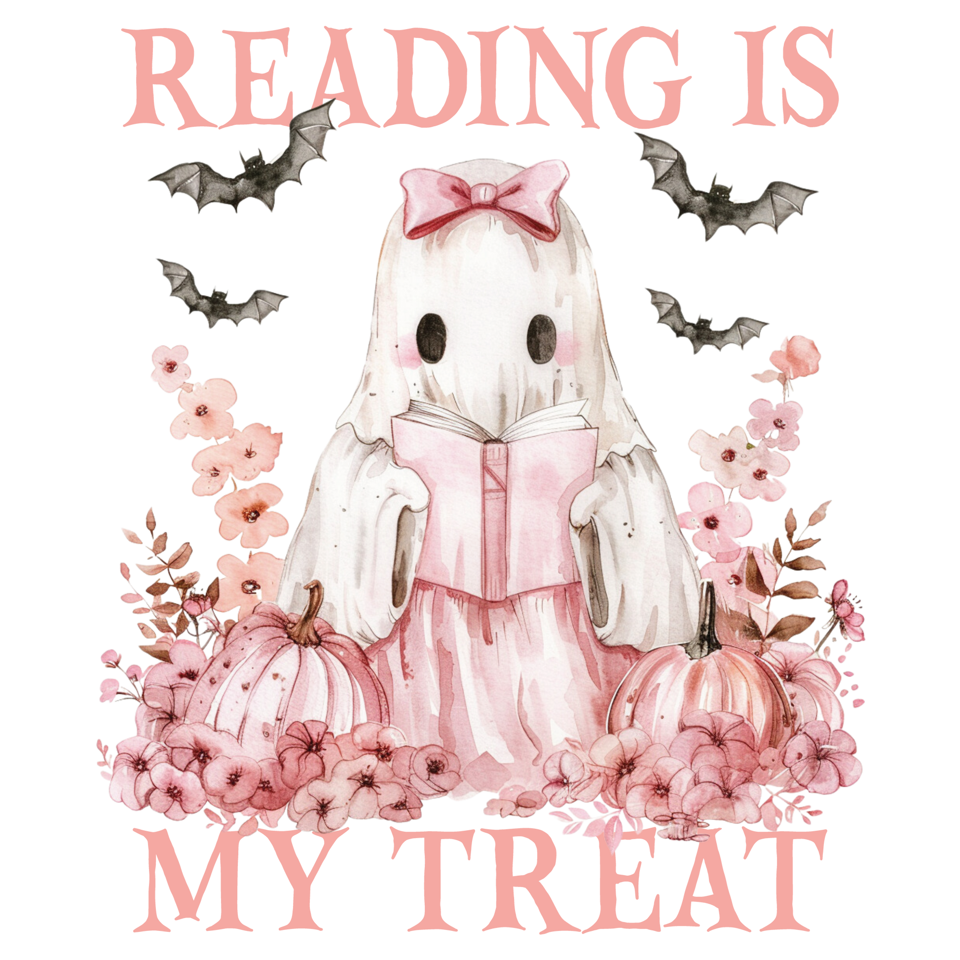 Motiv: „Reading is my Treat“ – Ghost Girl mit Buch, Kürbissen und Fledermäusen