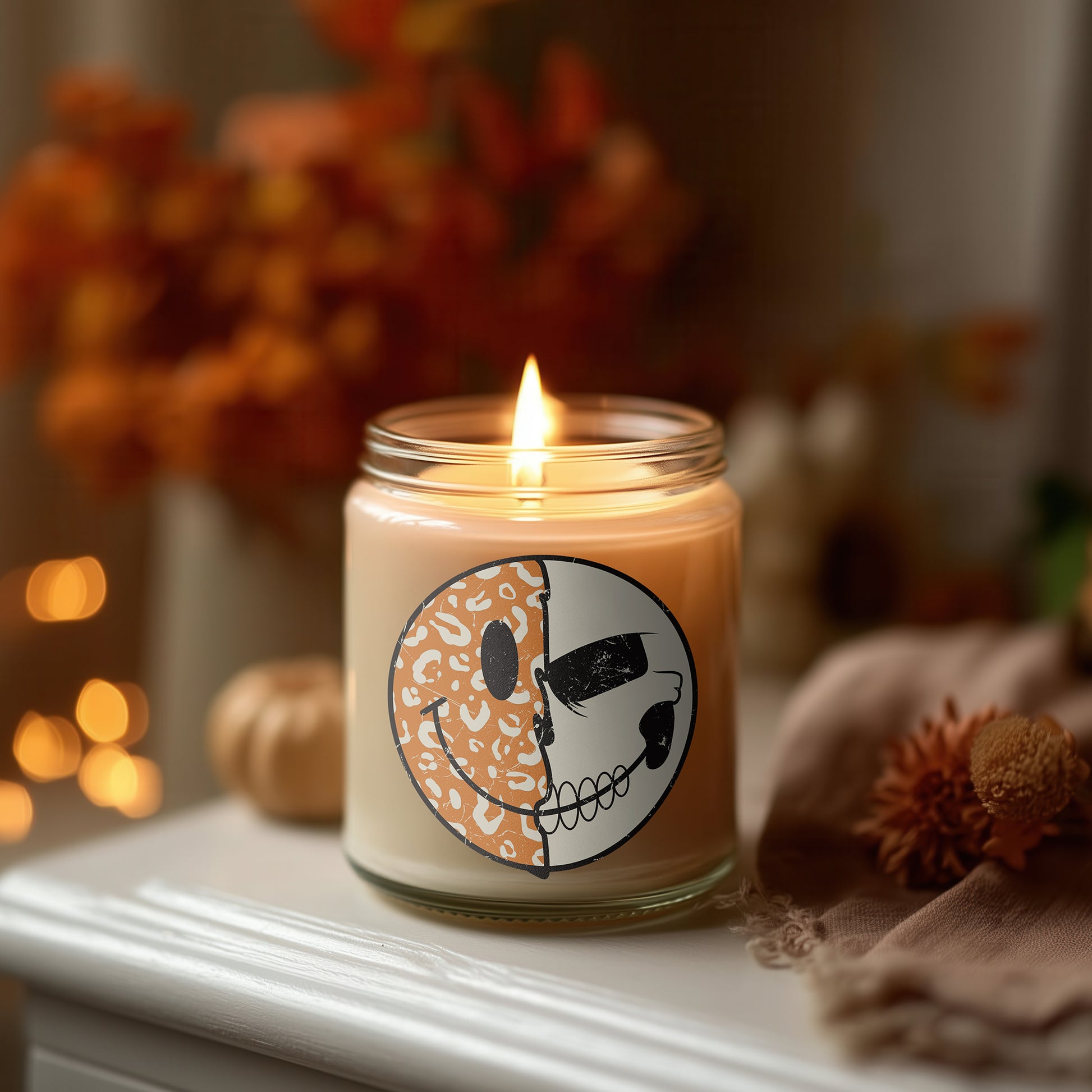 Smiley Skull Kerze Halloween Duftkerze Glas vegan Sojawachs, Retro Smiley Candle, Herbstdeko Geschenkidee Frauen, spooky Home Decor