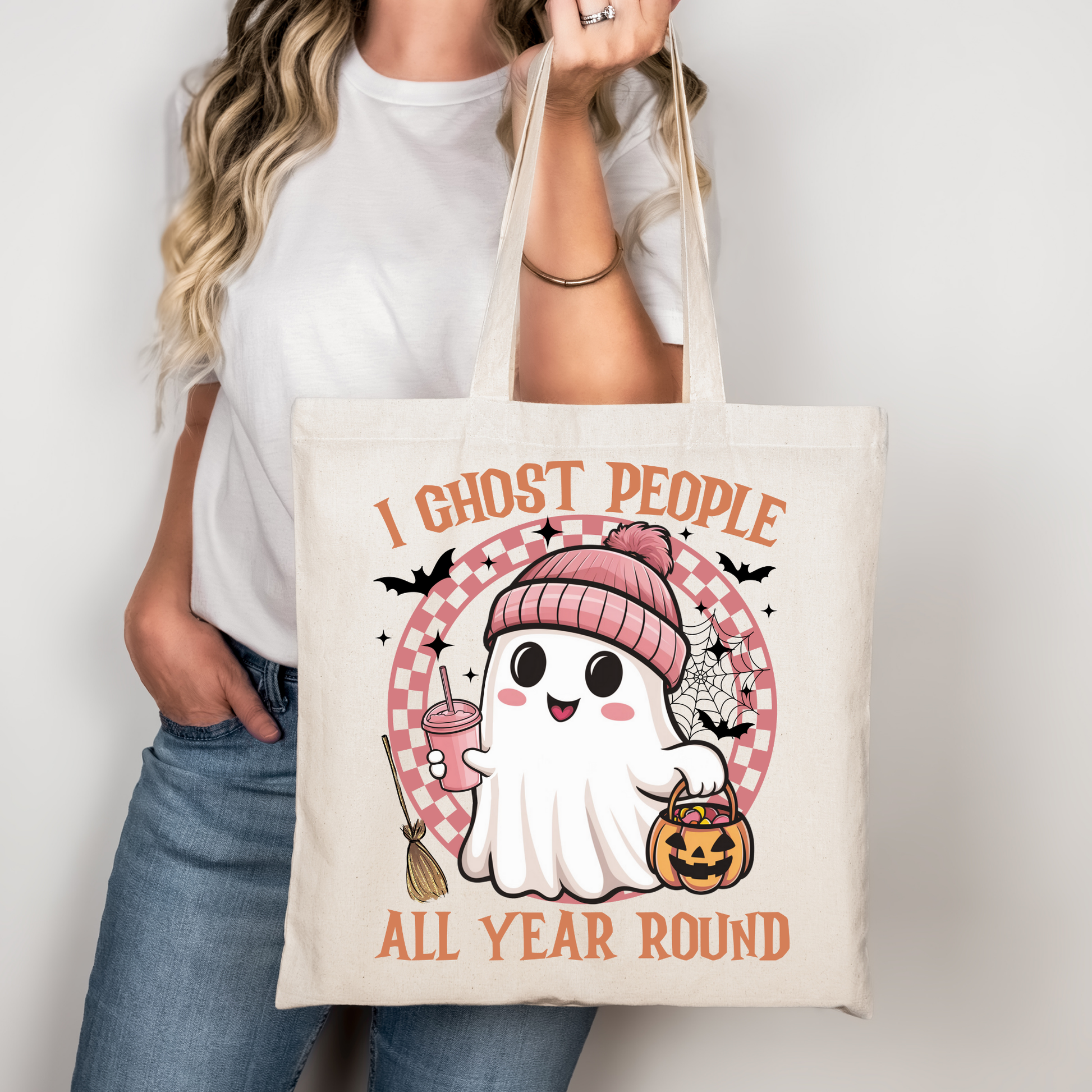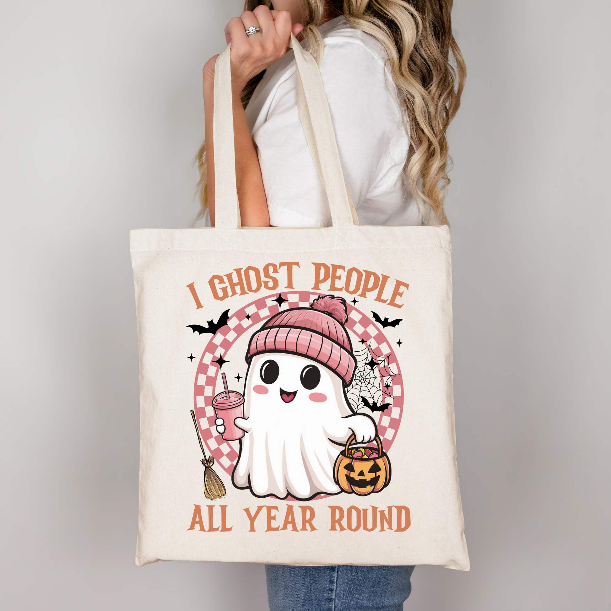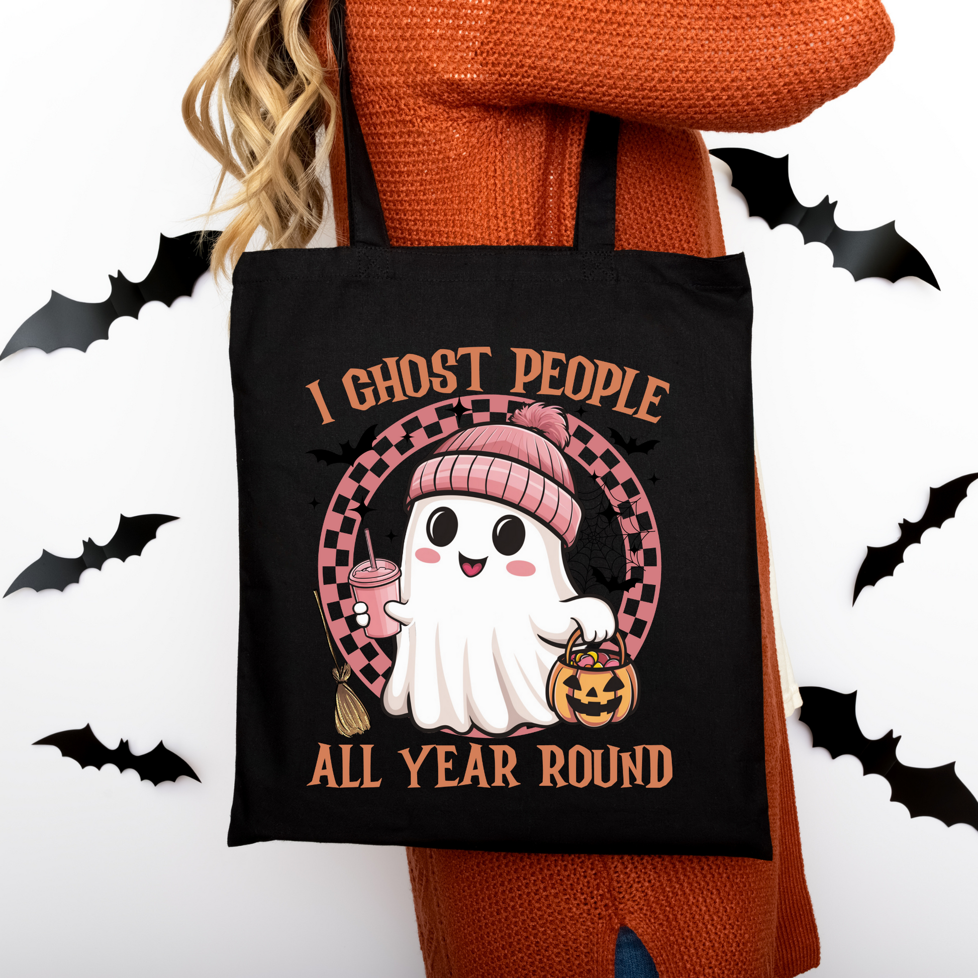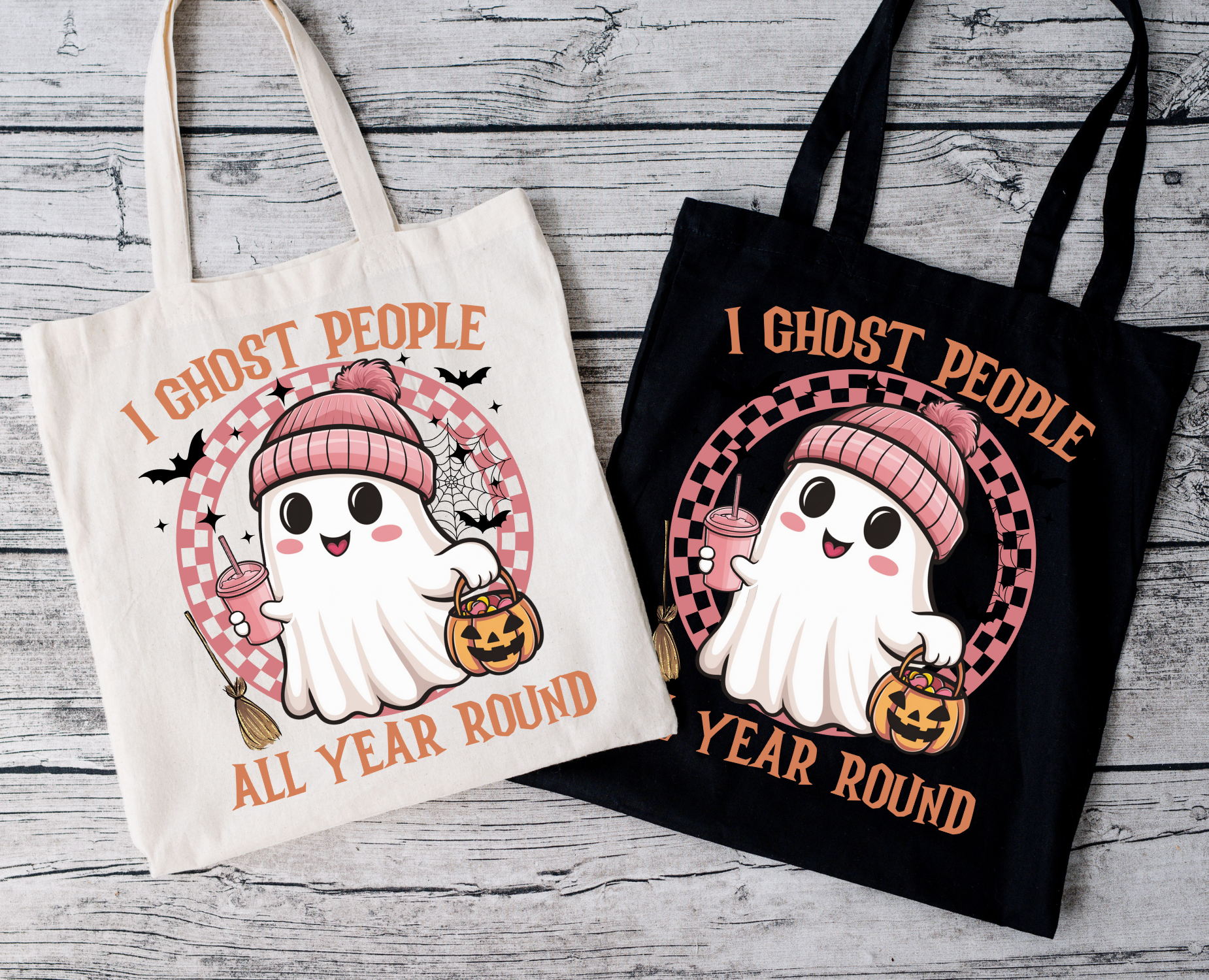 Tragetasche “I Ghost People All Year Round” | Halloween Baumwollbeutel in Rosa, Beige, Schwarz | Lustiges Geist-Motiv | DTG Druck | Auch als Bügelbild erhältlich