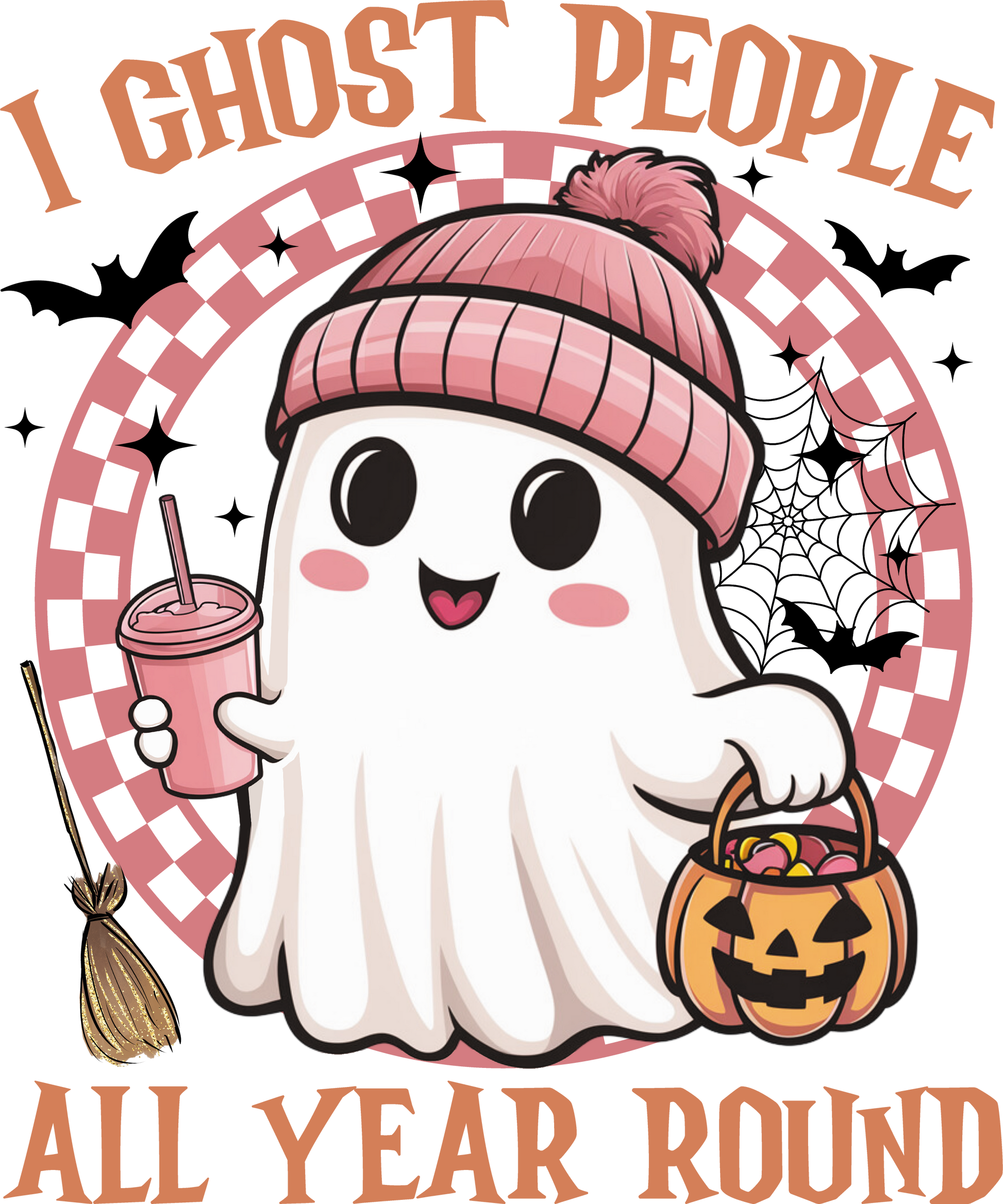 Diese stylische Tragetasche mit dem süßen Geist-Motiv ist ein echter Hingucker – nicht nur zu Halloween! Der Beutel trägt den frechen Spruch „I Ghost People All Year Round“ und zeigt einen niedlichen Geist mit Mütze, Kürbis-Eimer und Smoothie – perfekt für alle, die das ganze Jahr spooky bleiben.
